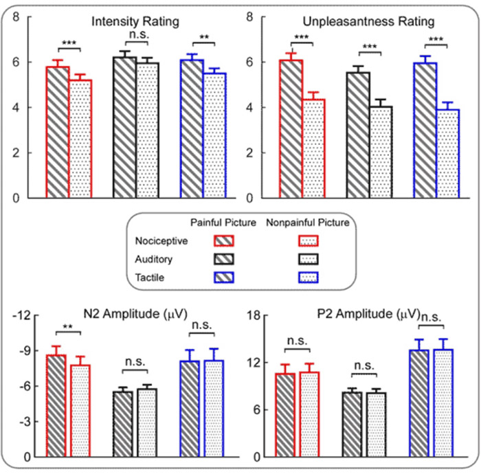研究结果显示,在行为水平上,相比观看非疼图片,观看疼痛图片后,被试对自身受到的感觉刺激的强度、不愉悦度和唤醒度的评分提高。该结果表明,疼痛共情对自身疼痛、听觉和触觉的主观感知均有增强作用。值得注意的是,被试对他人疼痛的关心程度评分(concernratings)预测了其对自身受到的伤害性刺激的不愉悦度评分,而被试对他人疼痛的注意吸引程度评分(attentionratings)预测了其对自身受到的听觉或触觉刺激的不愉悦度评分。该结果在一定程度上表明,疼痛共情对自身疼痛感知和非疼痛感知的启动作用涉及不同的心理机制。在脑电生理响应水平上,相比于观看非疼图片,观看疼痛图片后,伤害性刺激诱发了更大幅度的N2成分;而疼痛共情对听觉和触觉刺激诱发的ERP响应无显著影响。该结果同样表明疼痛共情对自身疼痛感知和非疼痛感知具有不同的启动作用。