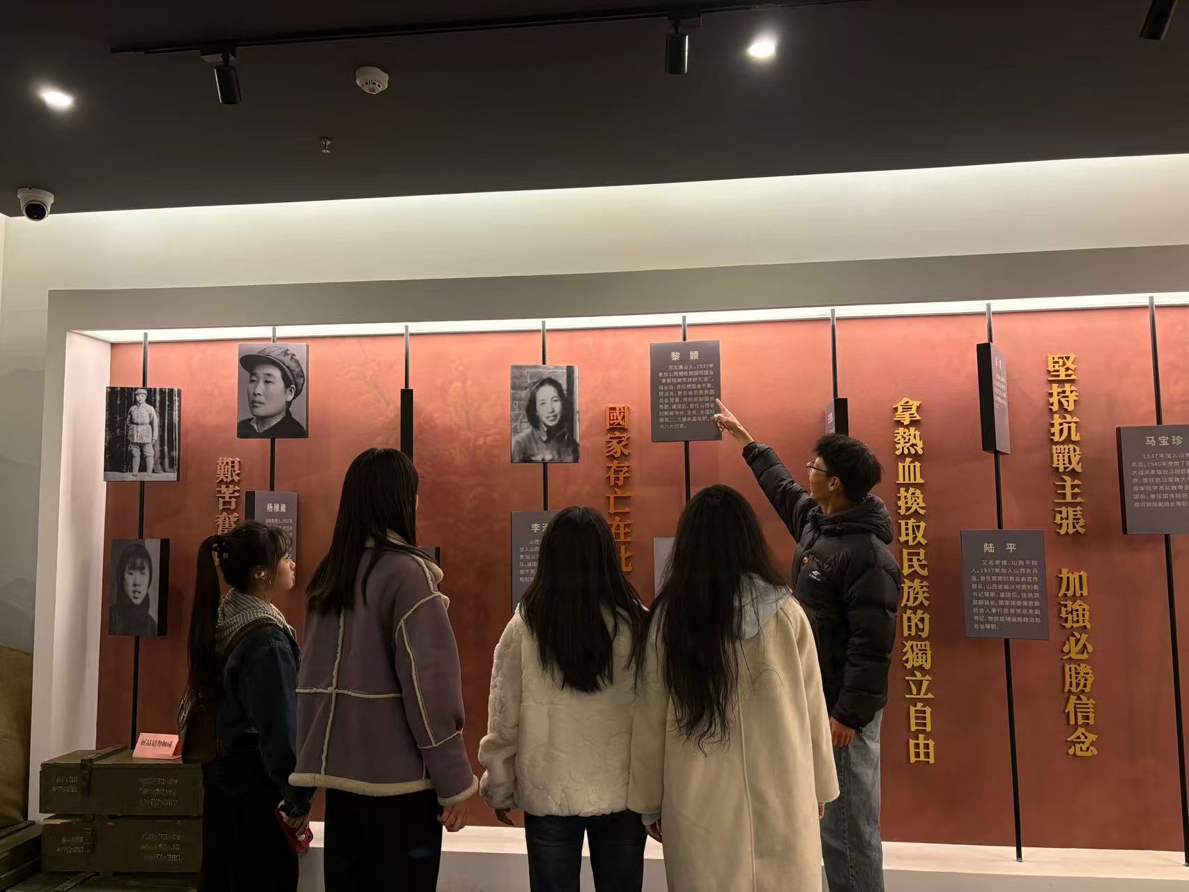 跟随讲解员的引导,同学们开始了沉浸式的参观。展览以丰富的文物陈列与逼真的实景复原,徐徐展开了一幅山河破碎却又众志成城的壮阔历史画卷。发黄的报纸、磨损的武器、泛白的军装、字迹斑驳的日记……每一件文物都在无声诉说着那段烽火连天的岁月。在“战火中的山西”实景复原区,同学们仿佛置身于当年的战壕与地道,直观感受到革命先辈们在极端艰苦条件下坚持抗战的非凡勇气。展墙上一张张年轻而坚毅的面孔,许多烈士牺牲时的年龄与在场的团员们相仿,这种跨越时空的“同龄对话”,带来了直抵心灵的震撼。