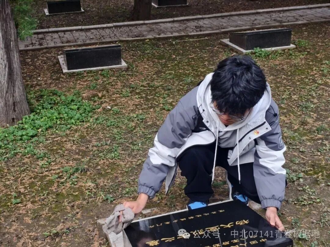 拿扫把的同学弯腰弓背,从墓区最外侧的小路开始清扫。落叶被秋风卷得零散,有的贴在石板缝里,有的堆在树底下,大家耐心地一点点扫拢。负责擦碑的同学细心地一遍遍擦拭着墓碑,将墓碑上的污垢全部擦去。