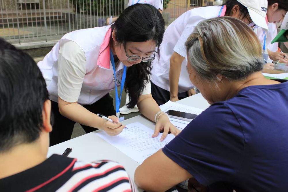 (图为筑爱支队队员在给居民进行问卷调查/钟栩祈摄)