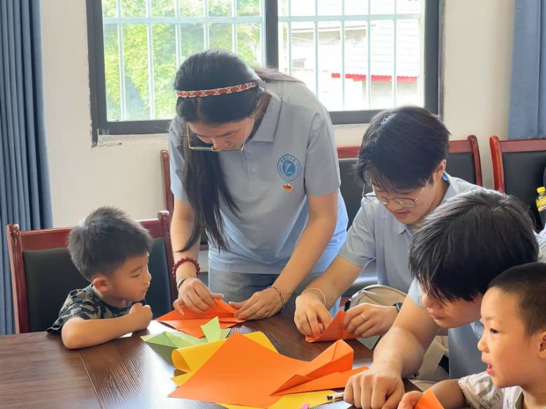 随后,课堂进入科技探索环节。团队成员展示了校士继航模队制作的飞行器模型,并深入浅出地讲解飞行原理,瞬间点燃了孩子们对科学的好奇心。在温馨的折纸飞机互动中,成员们手把手指导孩子们用彩纸折出形态各异的飞机。“我的飞机飞得最远!”一位小男孩高举着自己的作品兴奋地欢呼。当有孩子因折不好而焦急时,成员们便握着小手耐心引导,直到成功的笑容绽放。