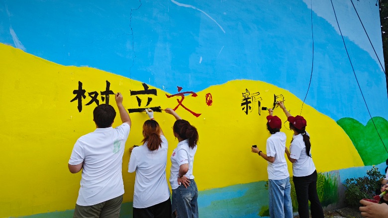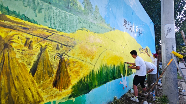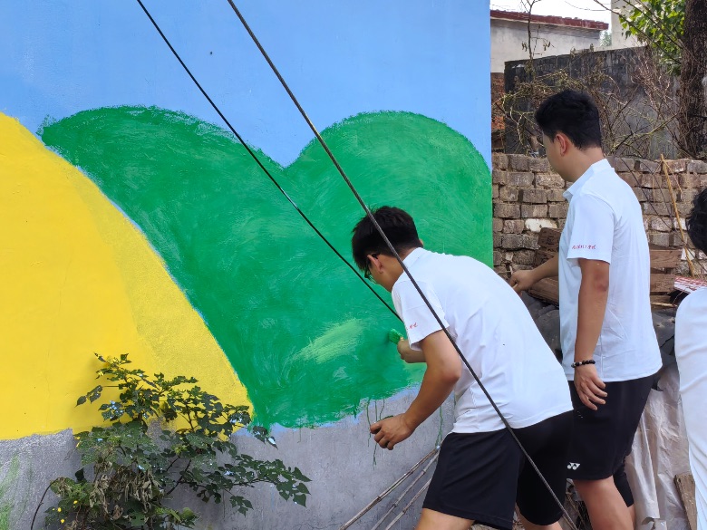 图为实践队员在对墙体进行彩绘