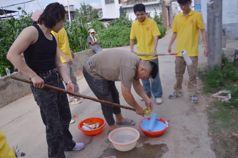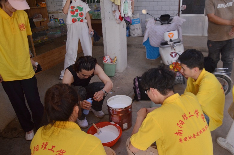 图为实践队员在整理墙面,制作粉刷工具