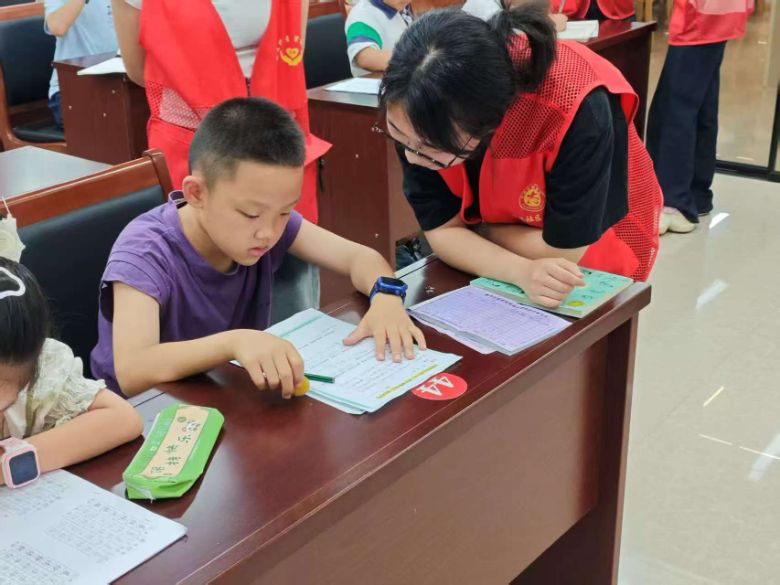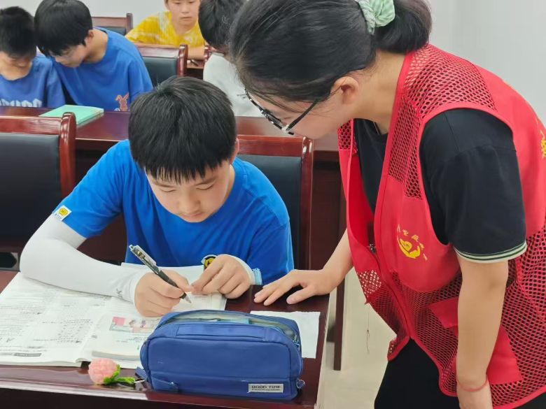 实践队以“课业辅导 + 多彩课堂”模式,为低龄学生打造暑期学习乐园。课业辅导中,队员化身“小老师”,针对不同年级、学科的知识难点,开展“一对一”或“小组式”辅导。摒弃填鸭式教学,用启发式引导让知识鲜活:把古诗词编成故事,将数学难题转化为生活实例。原本头疼写作的初一学生,都兴奋感慨“写作文像讲故事一样好玩” ,孩子们紧锁的眉头舒展,求知欲被点燃。