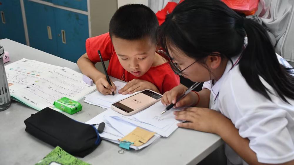 图为实践团成员与小朋友共同创作小猫简笔画。杨谢超摄