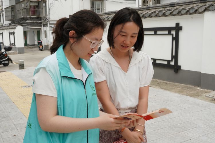 图为团队成员为社区居民讲解宣传册。陈天乐供图