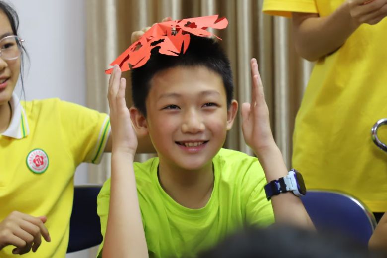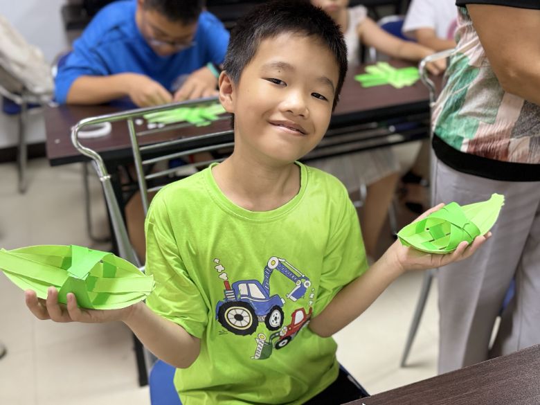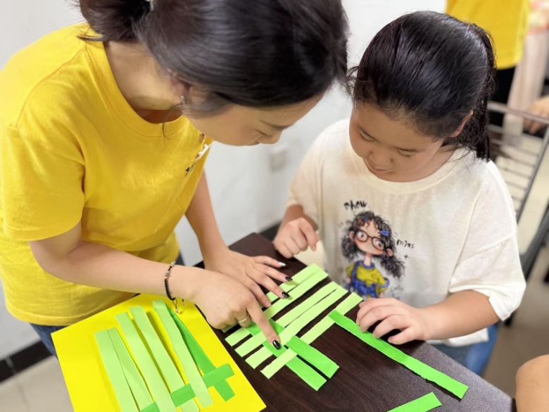 纸船载梦,古韵悠悠沁童心。纸编小船课上,实践队员以漕船为文化引子,分步讲解彩纸编织技艺。孩子们交叉叠放纸条、穿插固定,在与实践队员的互动中掌握方法。实践队创新“非遗+美育”模式,引导儿童感悟对称美学与结构力学,一艘艘小船承载童真想象成型,文化传承的种子悄然埋入童心。
