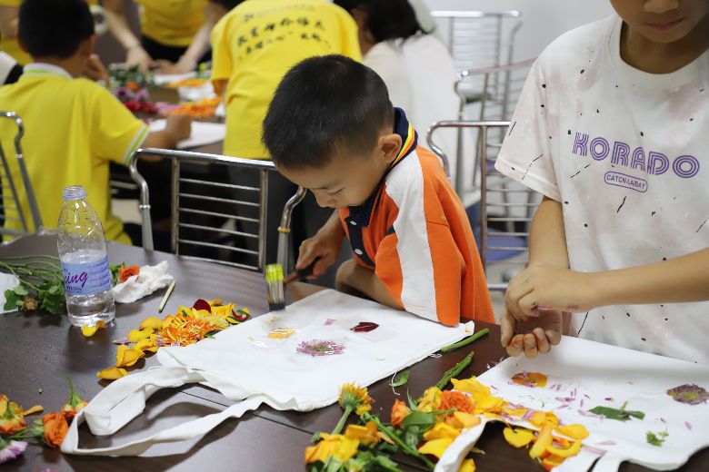 图为孩子们在进行制作植物拓染。杨丹盈摄