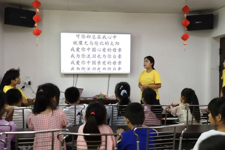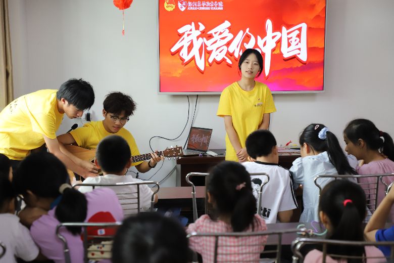 图为实践队员带孩子们演唱《我爱你中国》。林垲煜摄