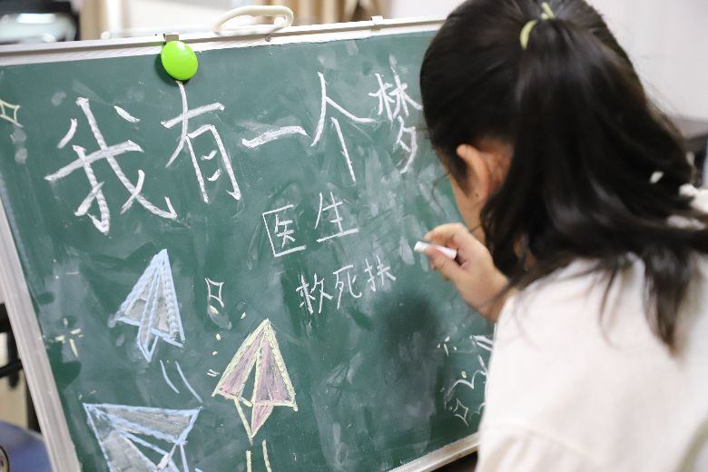 图为孩子们在黑板上写下梦想。杨丹盈摄