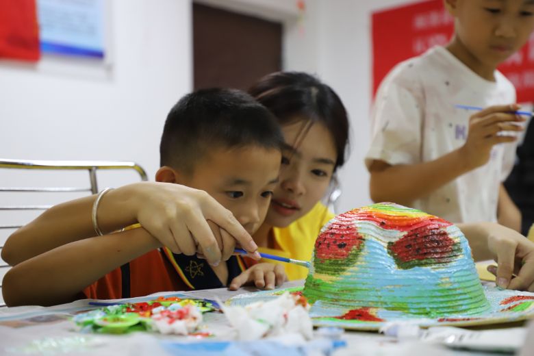 图为实践队员与孩子共同绘制夏日草帽。杨丹盈摄