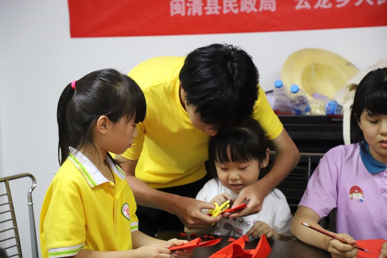 图为实践队员辅助孩子制作纸编小船。林垲煜摄