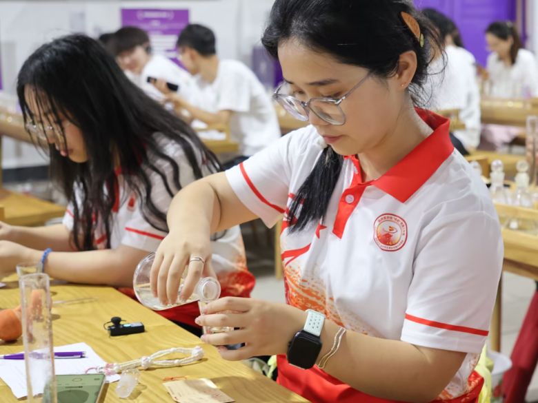 在勾调体验室,实践队员们迎来了核心的动手环节化身“调酒师”,首先进行闻香品鉴,专注辨别七个轮次基酒的风味谱系:从一轮次的“清新果香”逐渐递进到七轮次的“醇厚焦香”,境界渐深,层次分明。随后,在讲解老师的指导下亲手调制,按照建议比例精心混合不同轮次基酒。这一过程不仅是对味蕾的挑战,更让青年学子们亲身体验了“或甘或苦皆自酿”的酿造哲理,感悟匠心与人生的微妙关联。