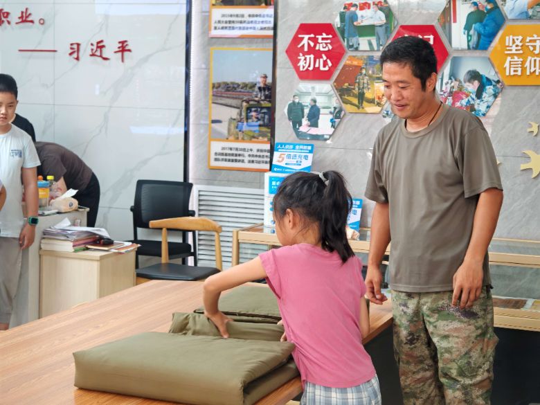 理论学习之后,动手实践环节紧随而来。退役军人的严谨作风如何体现?一场别开生面的“叠豆腐块”被子教学给出了答案。在退役军人代表的耐心示范下,“方正、有棱角”的规范要求被一一拆解。孩子们青涩的手指抚平褶皱、修整边角,在老兵手把手指导下反复尝试。看似简单的内务整理,让 “一丝不苟” 的军人品格悄然植根童心。