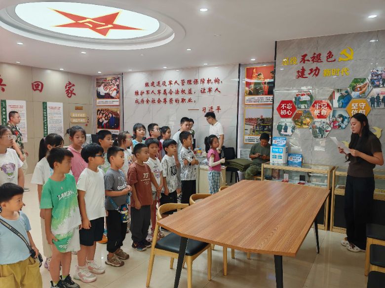2025年7月9日,山东大学小树林市中泉韵支教队带着满腔热忱,引领着一群朝气蓬勃的孩子们,走进了二七新村街道退役军人服务站。这是支教活动开展的第三天,一场主题鲜明、内容丰富的红色教育实践活动在此展开,旨在通过沉浸式的体验学习,在孩子们心中播撒下红色的种子,让爱国情怀深深扎根。