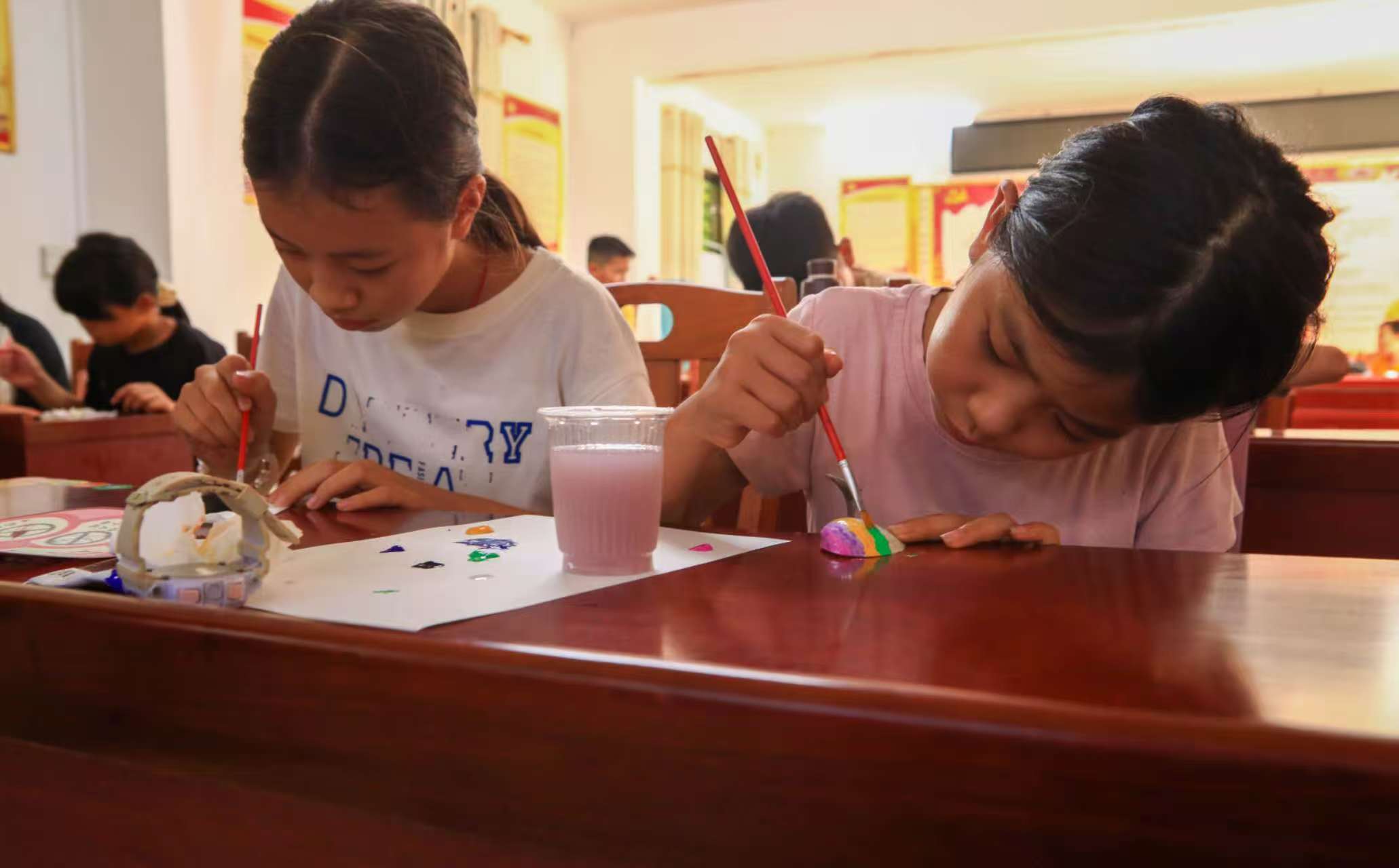 图为孩子们在志愿者指导下进行贝壳画创作 黄美姗 摄