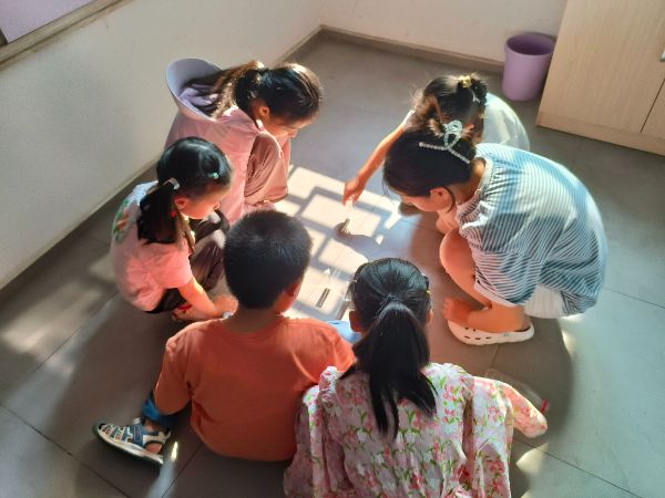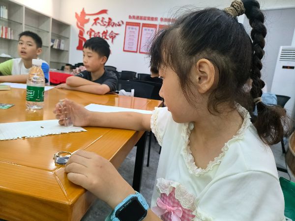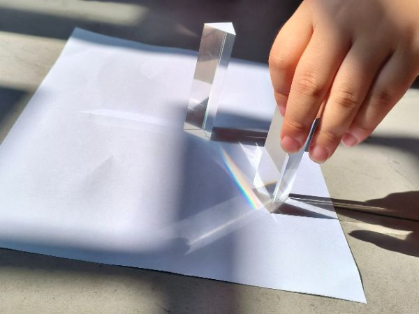 在实践环节,范美艳为小朋友们分发了三棱镜、白卡纸等材料,帮助小朋友们调整棱镜角度、寻找最佳光源。范美艳讲解了光源与三棱镜的放置方法。她说道:“将三棱镜固定在阳光下或白光光源照射处,使光线从三棱镜的一个折射面入射,再调整三棱镜的角度,让入射光线与棱镜的折射面形成合适夹角,确保光线能经两个折射面发生两次折射,最后在三棱镜的另一侧放置白卡纸,移动卡纸距离,直至上面清晰呈现红、橙、黄、绿、蓝、靛、紫的连续光谱。”