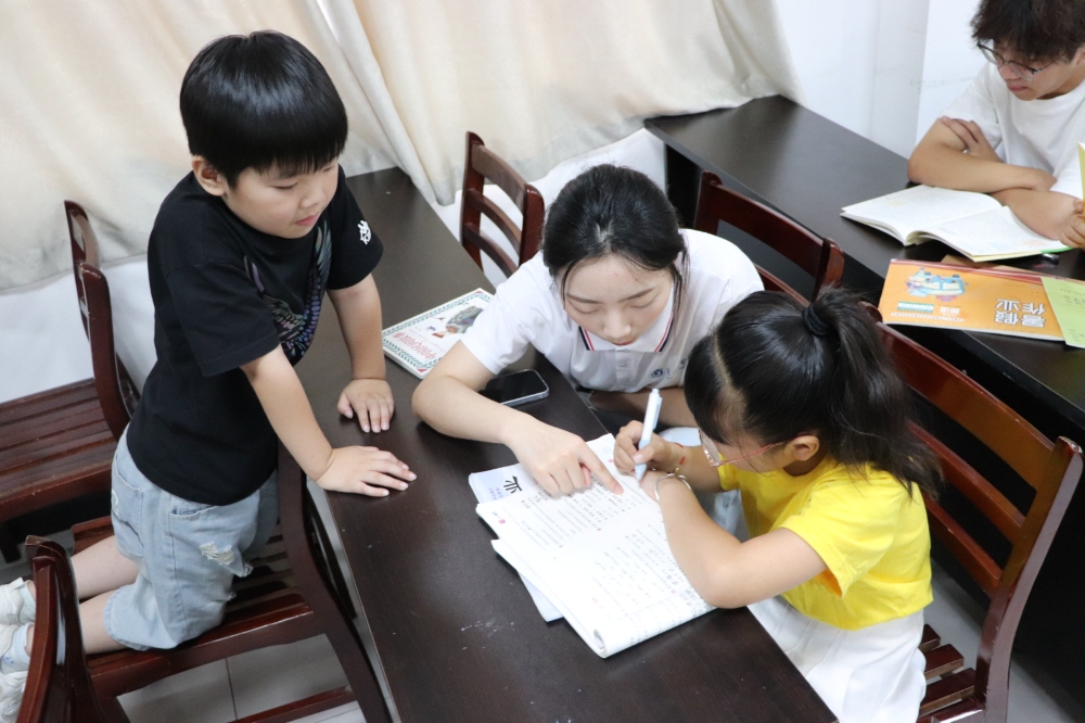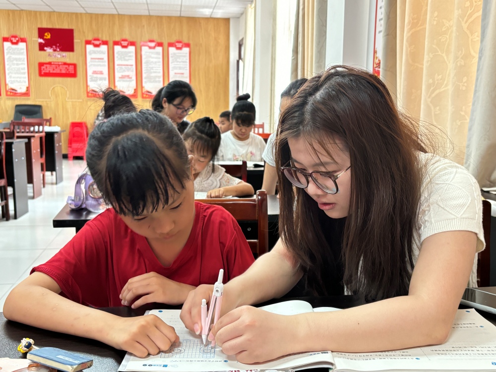 图为志愿者在帮助小朋友解决课本上的难题。方琛摄