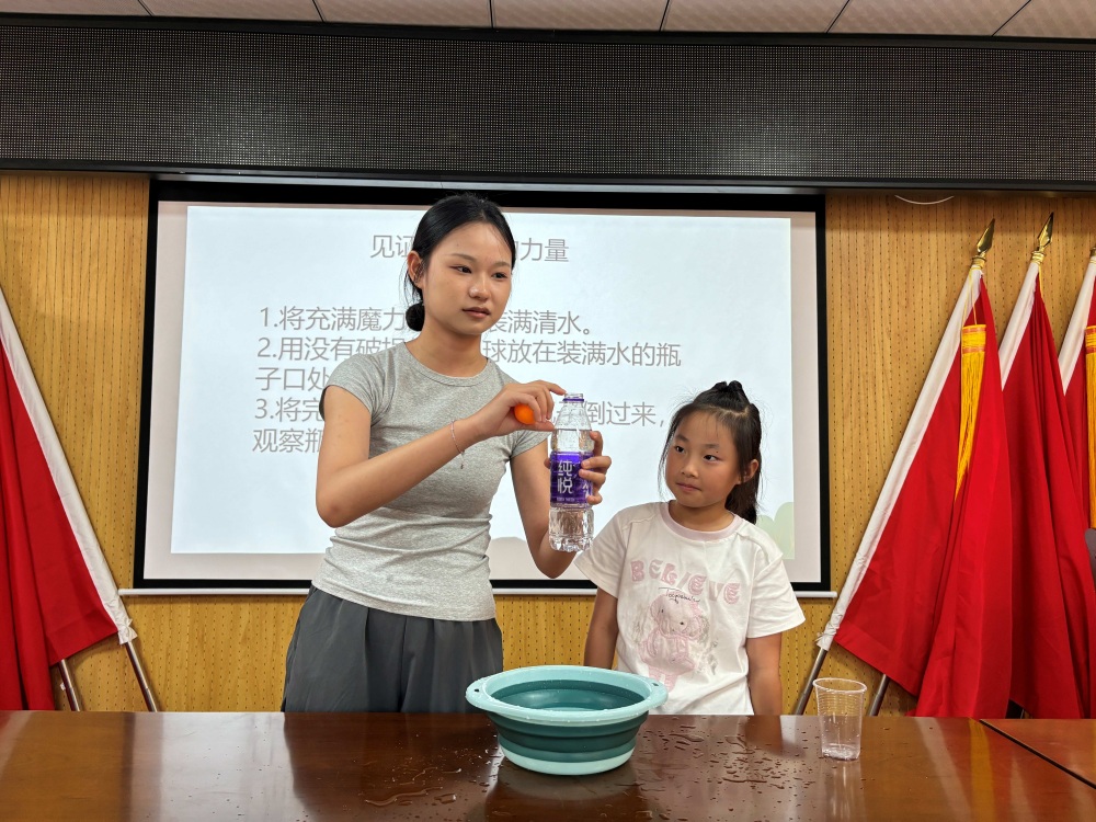 图为志愿者为小朋友讲解实验失败的原因,并积极引导小朋友完成实验。张慧摄