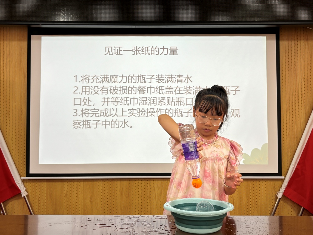 科学探索课程以“激发兴趣、培养思维、探索实践”为核心目标,设计了多个贴近生活、趣味十足的实验项目。例如图中所示的“见证一张纸的力量”和“见证一颗球的力量”,该课程主要讲授的是什么是大气压强以及其原理,并通过有趣的实验帮助小朋友们探索其中的奥秘,让小朋友们更加直观的了解其知识。