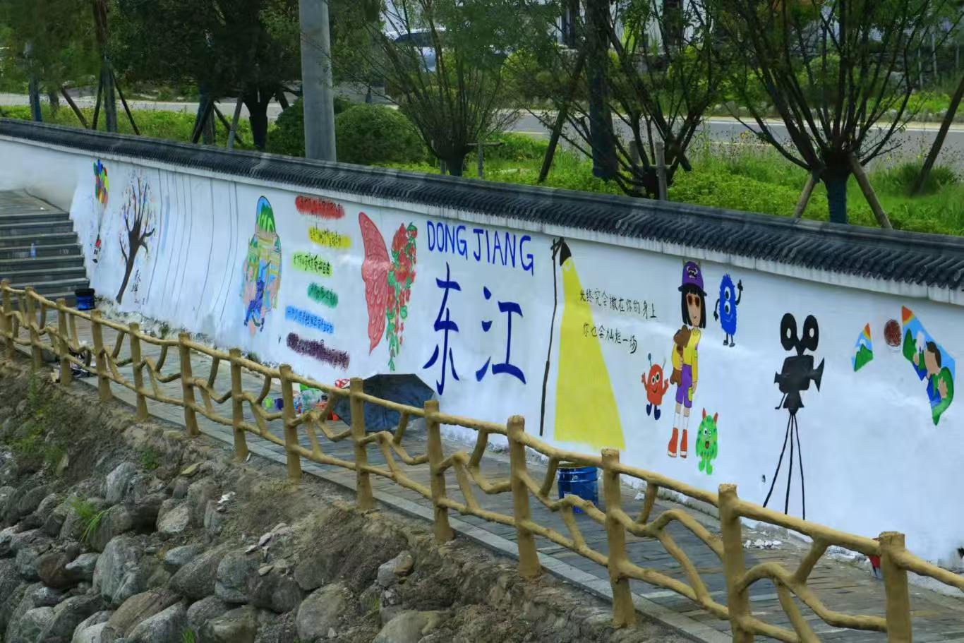 美化乡村也是此次活动的重要内容。一面原本朴素的白墙,实践队的队员们历经五天的精心创作,华丽“变身”为乡村艺术长廊,实践队以乡村振兴为创作脉络,将自然诗意融入画面:绘上象征乡土生机的树木与传递乡情的文字,以山水为底呈现乡村独特建筑,搭配奇幻形象增添活力。墙上醒目书写“DONGJIANG东江”,强化乡村地域标识。这些多彩墙绘,不仅以艺术点亮乡村日常,更尽显大学生创作者们助力乡村文化建设的巧思。墙绘激活乡村闲置空间,为乡村振兴注入艺术活力,成为乡村文化振兴路上的一抹亮色,也让青春力量在乡土大地绽放光彩。