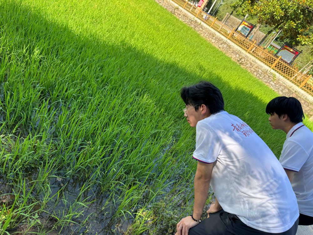 午后烈阳高悬,实践团转向村外田畴。连片稻田泛起绿波,蔬菜大棚错落有致,一幅现代农业画卷铺展眼前。在村农技员张师傅带领下,成员们蹲在田埂观察水稻长势:“这片田用生态肥,病虫害少,产出的‘红色田园’稻米,游客抢着买!” 顺着指引,远处红色旅游步道与农田相映成趣 —— 原来,中分村正探索 “红色文化 + 生态农业”融合模式:游客参观红色景点后,可体验农事、认购农产品,实现 “以红带农,以农促红”。