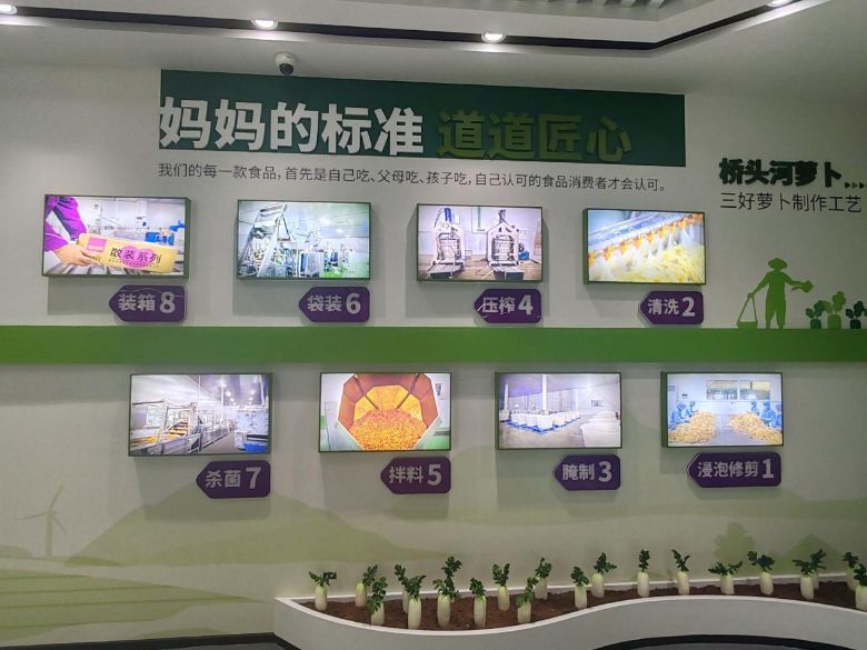 在展览厅的其余部分,团队成员们了解了“桥头河三好萝卜”所经历的转变过程:从浸泡、修剪、三次清洗、传统腌制,到自动化拌料、压榨、杀菌,八道工序共同展现了“每一步都充满匠心”的理念。展示墙上的标语“我们的食品首先自己吃、父母吃、孩子吃!”与企业所实施的ISO9001、HACCP双重质量管理体系相得益彰。讲解员指着展示墙上的照片详细说明:“我们的萝卜直接从无公害蔬菜基地采购,每千克含有0.0777毫克的硒,其清甜脆嫩的品质赢得了‘无需添加油脂,夹起两端即可见汁液流淌’的美誉。”