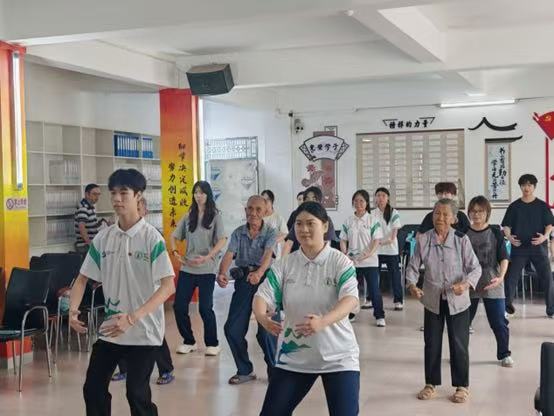 在活动现场,“医旅助青藤”突击队深入当地,为老年村民现场教授八段锦。作为一项源远流长的中国传统养生功法,八段锦以其舒展优美的动作、锦缎般的流畅韵律著称,兼具强身健体、调和身心等多重保健功效。教学过程中,队员们细致拆解每一式动作要领,确保老人们准确掌握。现场预留充足练习时间,队员们全程陪伴,及时进行个性化指导和动作纠正。通过这种理论与实践相结合的方式,帮助老人们快速入门,将八段锦融入日常,实现养生保健,提升晚年生活品质。