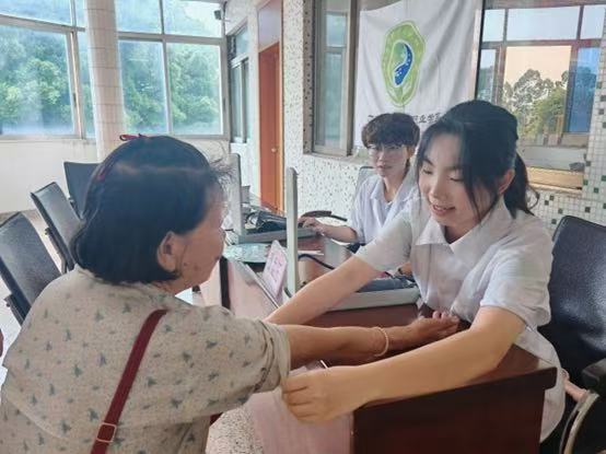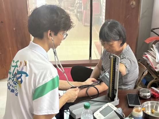 “医旅助青藤”突击队在上巷村委会二楼开展集中义诊的同时,还主动走进村民家中,开展入户健康服务,双管齐下为村民健康筑起“防护网”。活动现场,队员们细致地为前来的村民免费测量血压、血糖,每一次精准读数,都体现责任担当;每一份详实记录,都是健康承诺。而在入户走访中,队员们携带便携式医疗设备,为行动不便的老人、留守村民提供上门血压、血糖检测服务。这不仅是一次义诊活动,更是青年学子践行医者仁心、服务基层的生动诠释。他们用专业传递温暖,以行动守护健康,将汗水挥洒在乡村振兴路上,诠释新时代青年服务社会、奉献基层的使命担当,贡献筑牢乡村健康基石的青春力量。
