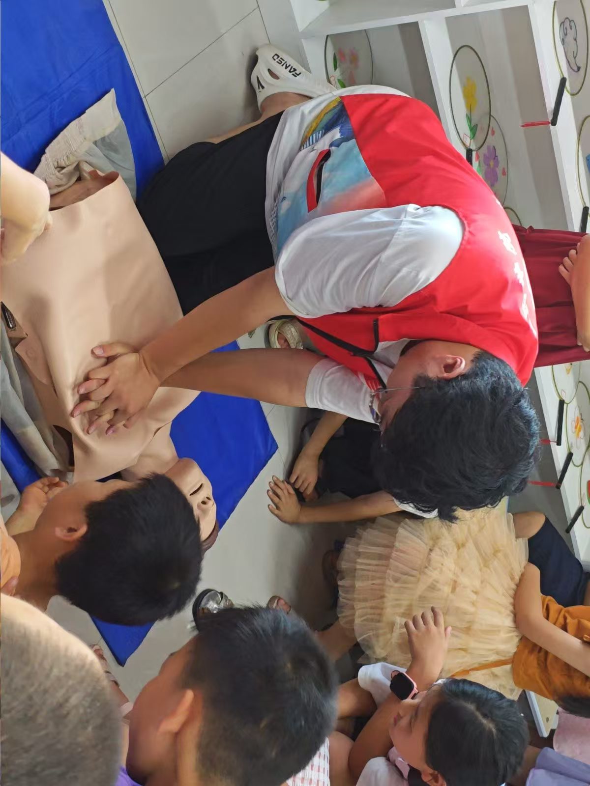 在观看完视频之后,便到了孩子们心心念念的实践环节,在道具假人拿出来的时候,孩子们脸上的情绪各不相同,有惊喜,有疑惑,有兴奋,对着假人摸摸看看,很是好奇。