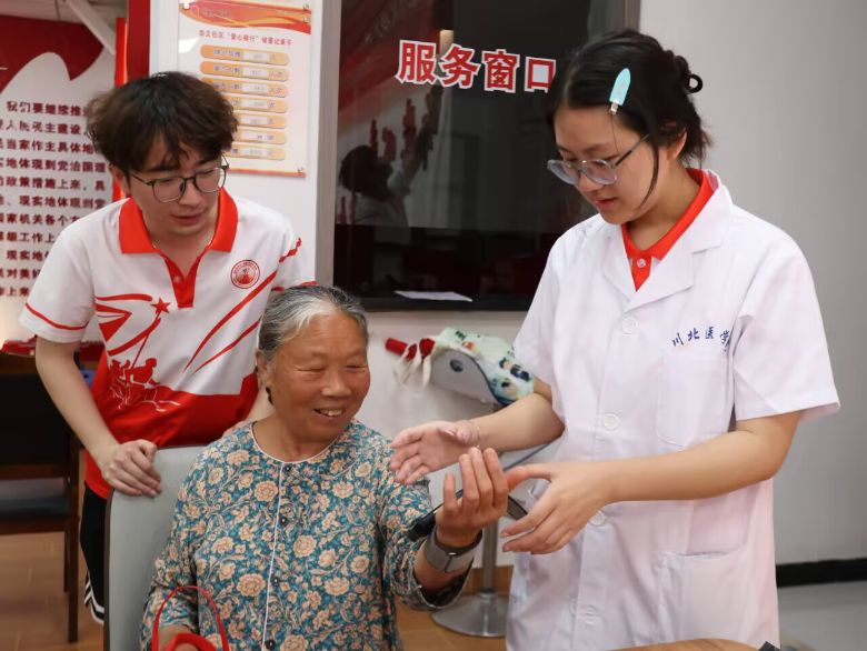 义诊服务区前,居民们热情高涨,纷纷排队等候检查。队员们一边普及高血压糖尿病等慢性病知识,一边熟练操作专业设备。腕式电子血压计在“一拉、一围、一紧”的简单操作下,精准呈现高压、低压数值及脉搏情况;新型血糖仪通过“一擦、一采、一吸”的便捷流程,清晰显示血糖结果。整个义诊过程高效有序,队员们还贴心地为老人们记录检查数据、提供健康建议。活动尾声,队员们为参与活动的老人送上实用的生活用品,老人们握着队员的手,不住地夸赞:“你们这些娃娃,真是帮了我们大忙!”