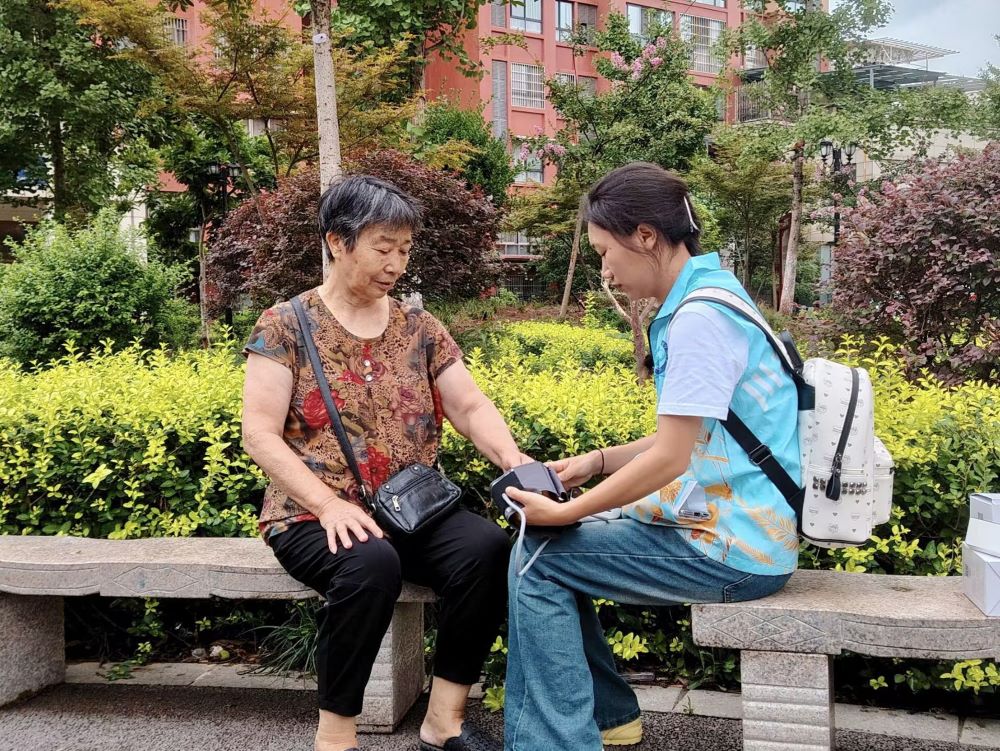 健康检测:专业护航健康 上午开展了健康检测,这是专业知识的“落地检验”:队员们依据医学规范校准血压仪、血糖仪,确保检测数据精准,严格遵循操作流程,将专业的医学内容转化为居民听得懂的健康建议。