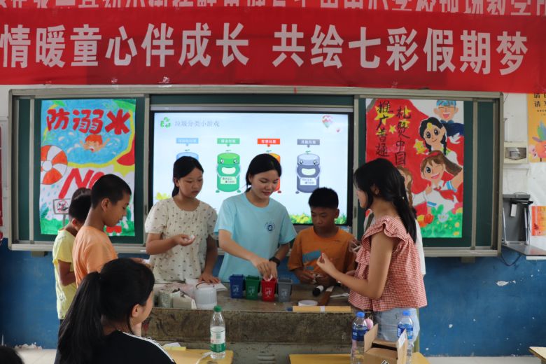 图为环保课堂上,实践团成员与孩子们进行垃圾分类小游戏 伍英桃摄