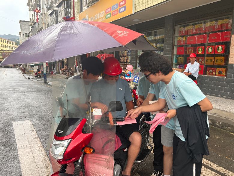 图为实践团成员向摩的师傅讲解交通安全及防电信诈骗知识 朱梦如摄