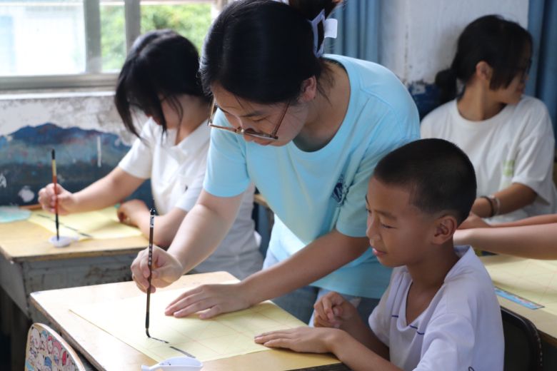 图为书法课堂上,实践团成员指导孩子们写毛笔字 朱梦如摄