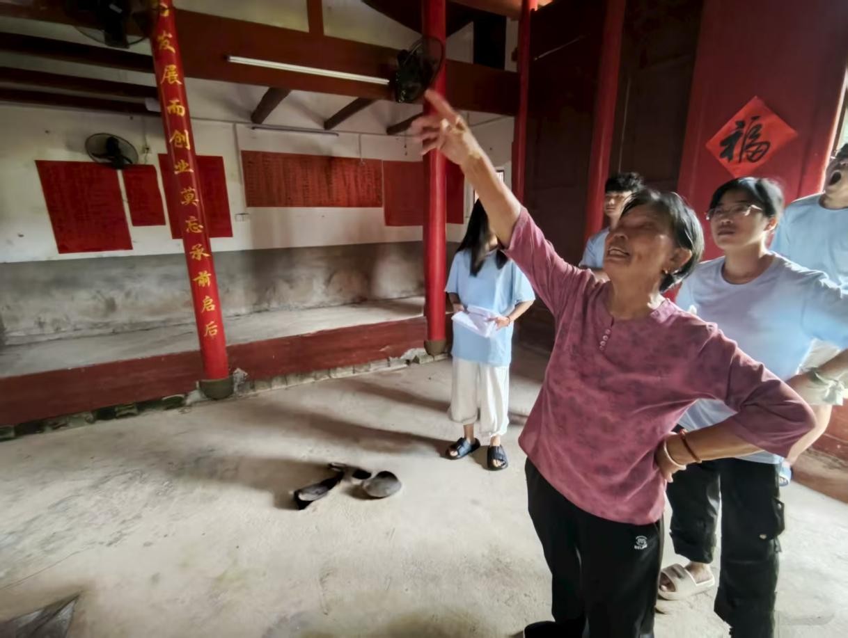 紧接着,在范奶奶的热情指引下,实践团成员一同走进村里的百年祠堂。檐角的岁月痕迹与梁柱的斑驳纹理间,范奶奶缓缓讲述着祠堂的古老由来与承载的宗族记忆,那些关于传承、凝聚与守望的故事,让大家深深感受到村落历经百年沉淀的厚重历史底蕴。