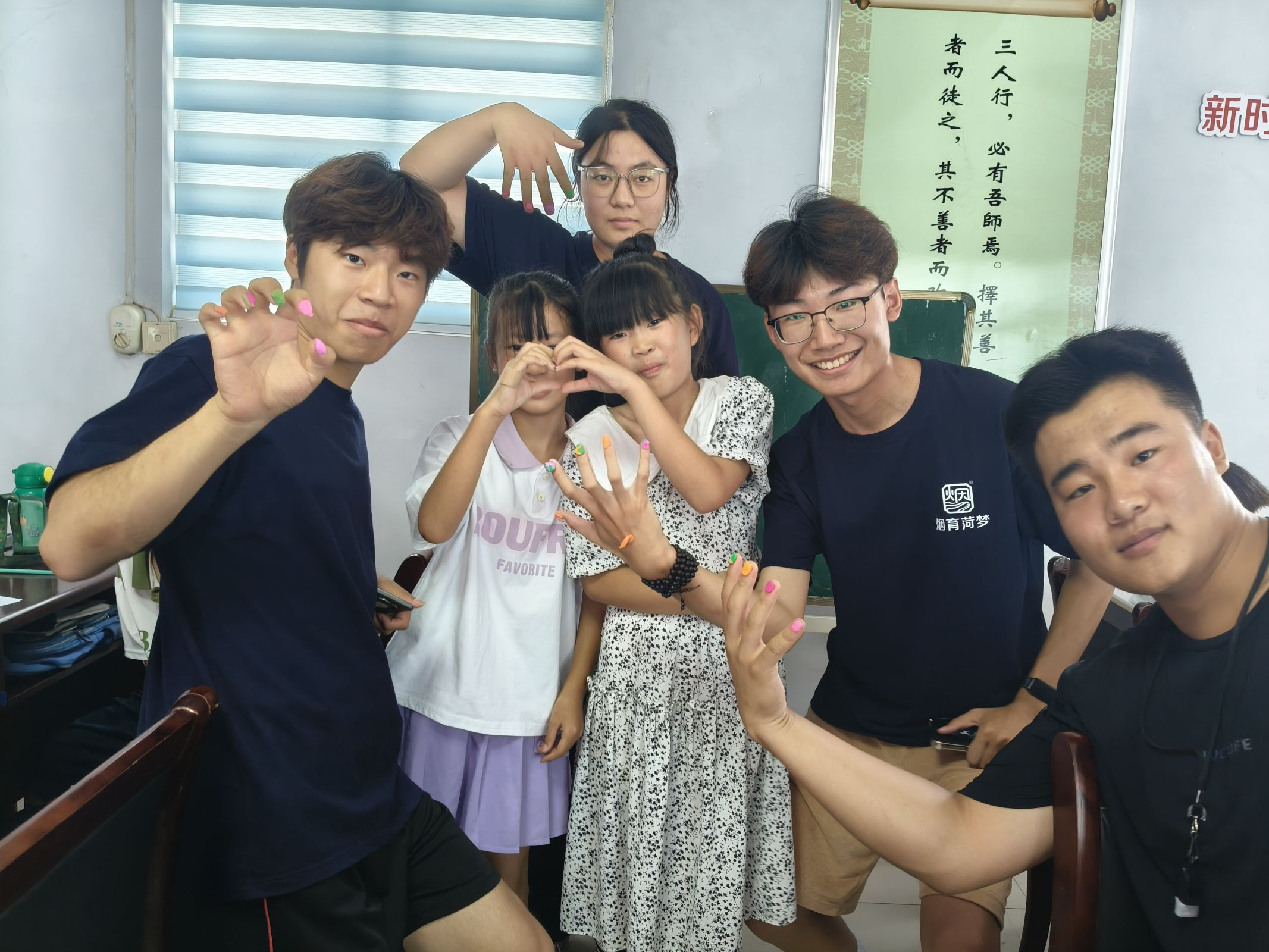 彩泥创作环节,大家围在一起,任由想象力肆意发散,把彩泥捏出各种奇妙模样。更有学生提出:“用彩泥给老师做美甲!” 于是,队员们的指尖,被孩子们精心装点上彩泥捏的小花、星星,还有奇形怪状的小图案。这充满童趣的互动,让彼此距离瞬间拉近,支教队员融入孩子们的世界,变得格外轻松自然,双向的温暖与联结,就在彩泥的揉捏、欢笑的传递中,牢牢扎根 。在这堂课里,我们看到了孩子们无限的想象力和创造力。他们用简单的线条和色彩,勾勒出心中五彩斑斓的世界。每一幅画都是他们内心的一次真诚表达,每一笔都饱含着对生活的热爱和对未知的好奇。