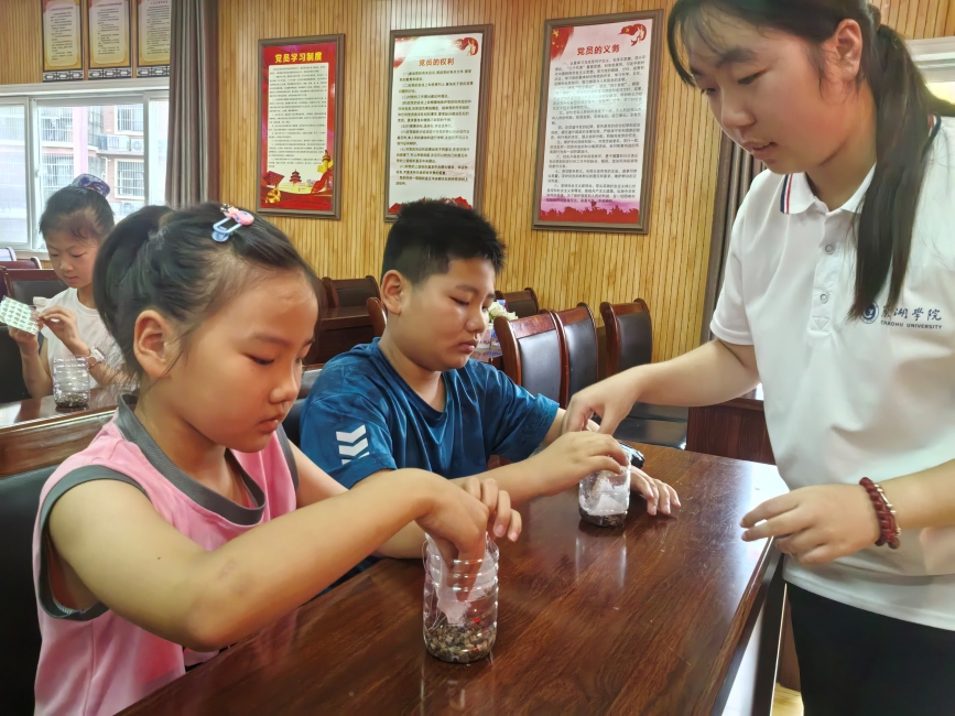 近日,巢湖学院“我是小小实验郎”三下乡团队来到宿州市三八街道港利社区,为这里的小朋友们带来了一场集科普体验与关爱调研于一体的暖心活动。他们充满活力地通过生动有趣的生态瓶制作、绚丽多彩的花朵染色实验,在炎炎夏日里为社区儿童送去知识与关怀。