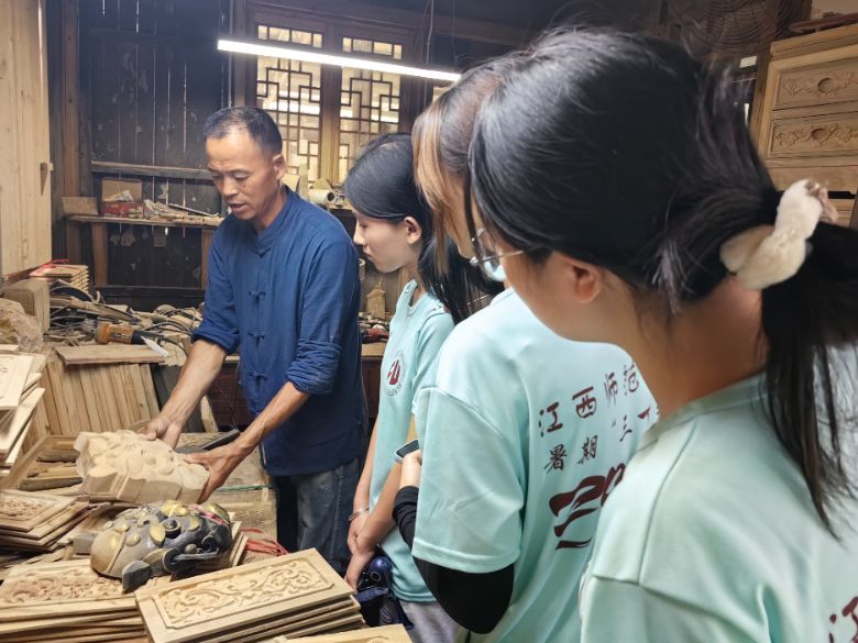 7月8日,为深入了解非物质文化遗产的保护与传承现状,江西师范大学外国语学院“乡村振兴青藜乡探团”暑期三下乡实践团队走进三雕传承人洪广德师傅的工作室,深入探访傩面雕刻技艺,聆听这位木雕大师的匠心故事,感受非遗文化的深厚底蕴与时代创新。