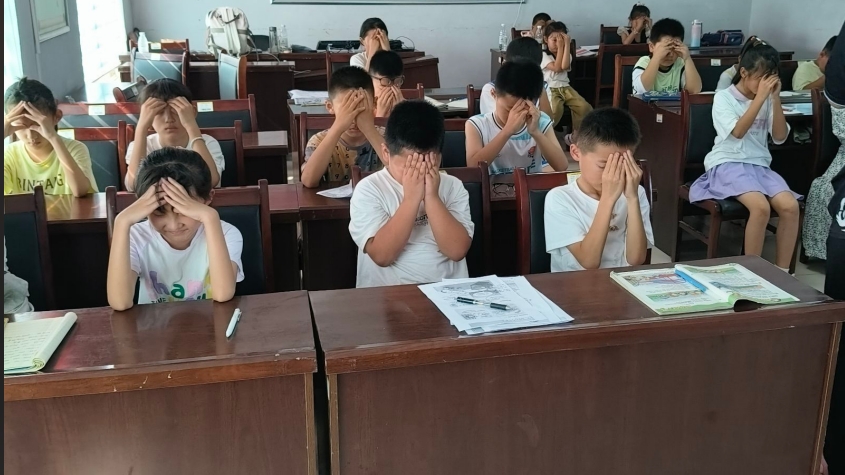 眼保健操时间,队员们化身 “护眼小卫士”。他们将标准动作视频投放到大屏幕上,逐个纠正学生的姿势:“中指要放在太阳穴上”“不要用手压眼球”。对于动作不标准的学生,队员们蹲下身来手把手教学,直到他们掌握正确方法。“老师说这样做眼睛会更亮,以后能看清楚远处的黄河。” 四年级学生姜子沫认真地说,小手跟着音乐节奏一丝不苟地按揉穴位。