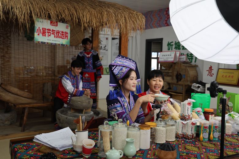 7月11日,广西职业师范学院工商管理学院“三下乡”社会实践团13名师生来到忻城县“农特产品展示中心”。他们依托专业所学,在忻城乡村特产中心开展了一场别开生面的直播带货体验活动。此次活动为地方优质农产品插上“云翅膀”,拓宽了乡村振兴新路径。镜头前,身着精美壮锦元素服饰的学生热情洋溢,向云端观众展示着忻城乡村特产中心的宝藏产品。