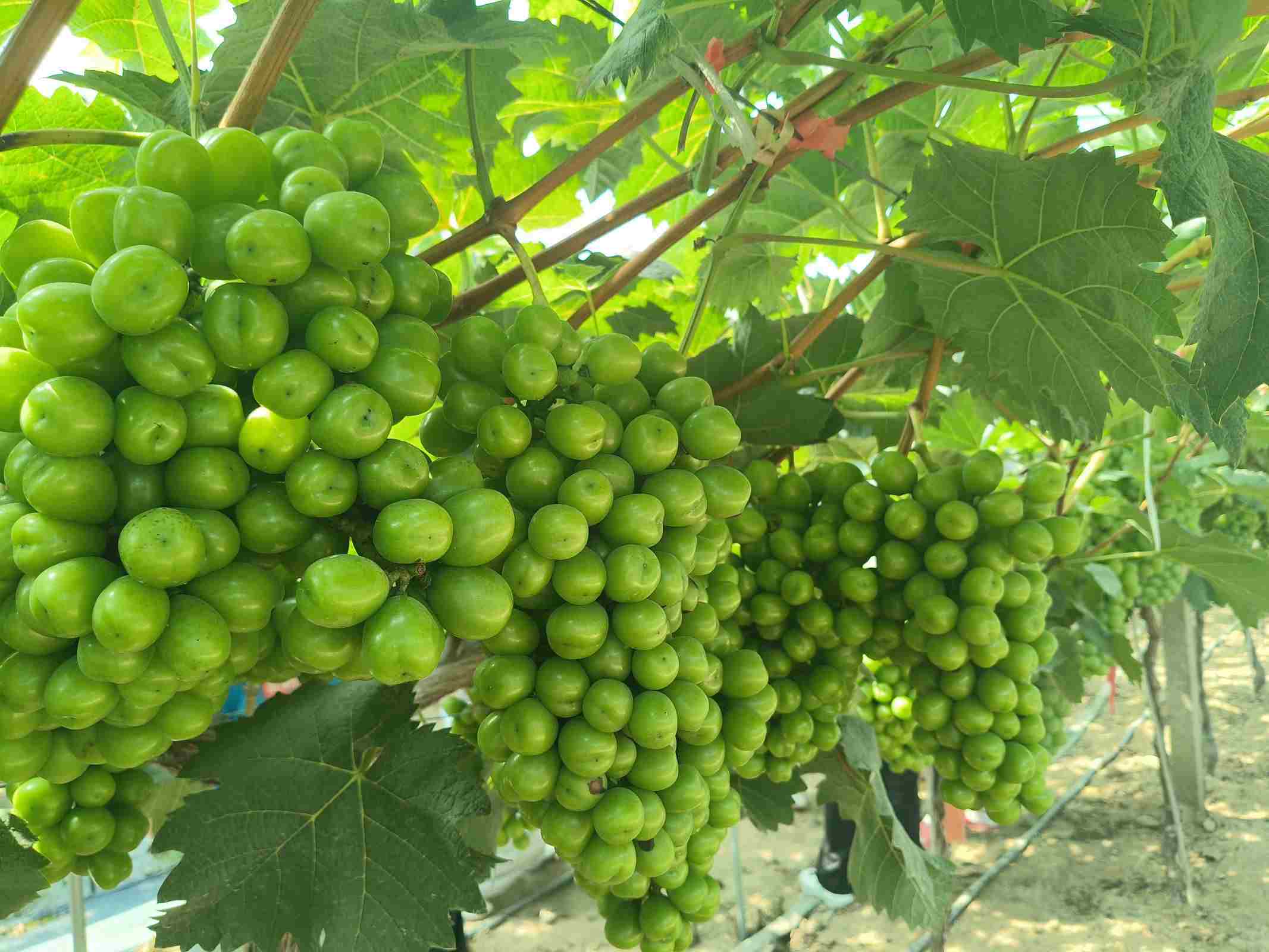 调研团的第一站走进当地的葡萄种植园。踏入绿意盎然的葡萄园里,一排排整齐的葡萄藤架上,成熟的葡萄、阳光玫瑰等优质品种果实饱满,在阳光下泛着晶莹光泽。据调研团的采访反馈,同大镇农户参与镇政府组织的智能设备操作培训后,生产效率大幅提升,葡萄精度与产量同步提高。