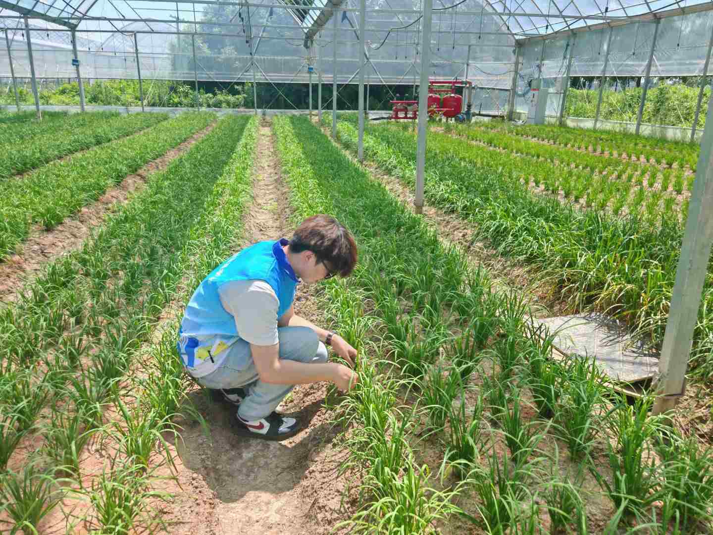 离开葡萄园后,调研团步入总面积达500亩的紫荆村蔬菜种植基地,标准化连栋大棚整齐排列,棚内韭菜、豆角、小白菜等时令蔬菜长势喜人,五彩菜地和水乡农舍相映成趣,景美如画。基地负责人介绍,作为合肥市重要的保供基地之一,紫荆村依托智慧农业技术构建起全链条数字化管理体系,实现蔬菜从播种到采收的全周期精准管控。