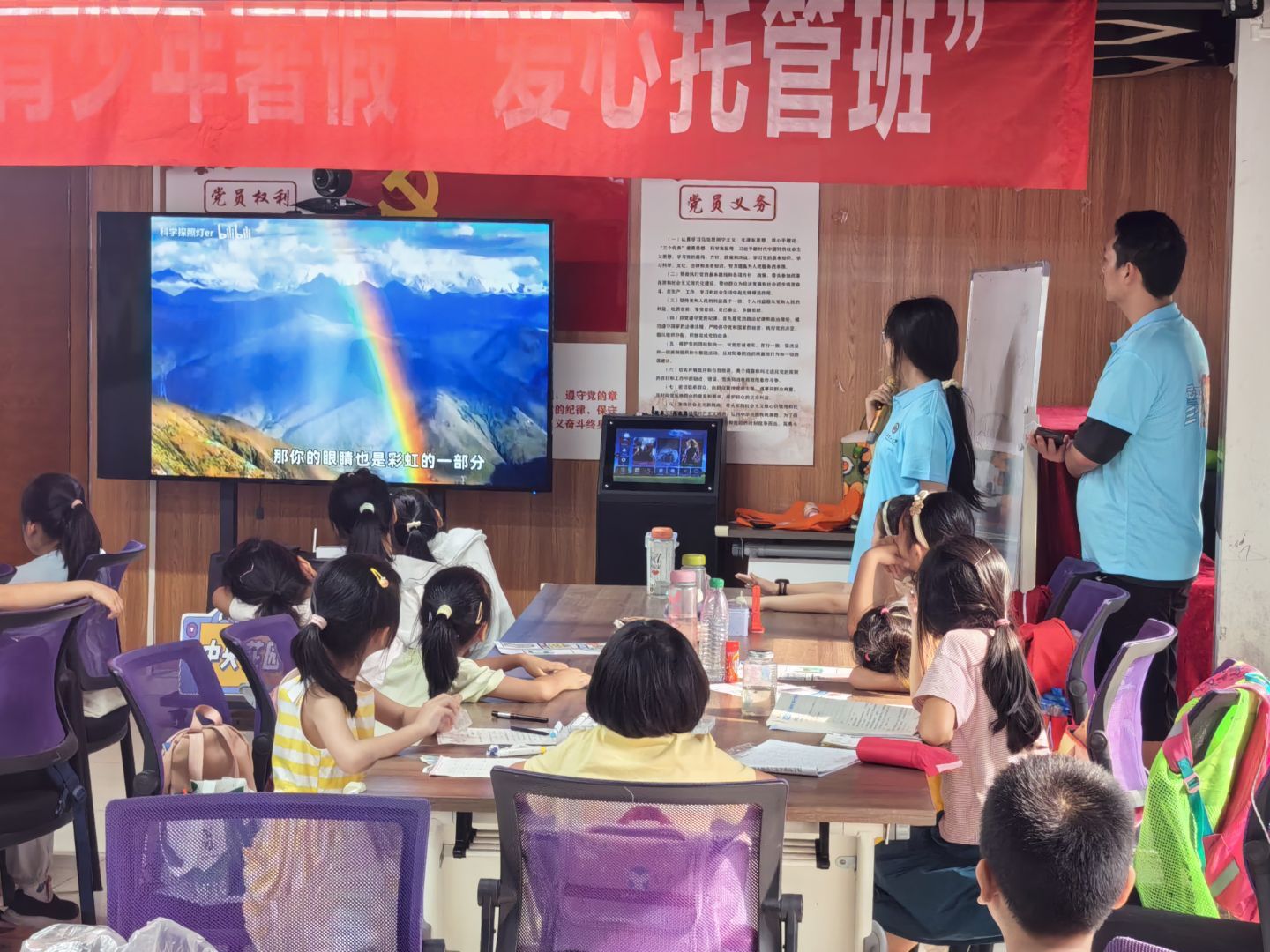 2025 年 7 月 10 日下午 4 点,中心花园社区托管班里座无虚席、热闹非凡。热血启智社会实践队的队员们带着精心制作的“科普彩虹的形成与光的色散”PPT,为小朋友们带来了一场精彩纷呈的科普讲座。