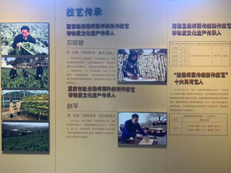 在技艺传承展区,涪陵榨菜传统制作技艺的传承谱系与发展历程引人驻足。作为国家级非物质文化遗产,该技艺的传承人群像鲜活呈现:国家级传承人万绍碧深耕技艺数十载;同为国家级传承人的李朝盛、白长文等,以坚守诠释“诚信至善、固本开新,精益求精、守正创新”的行业精神。