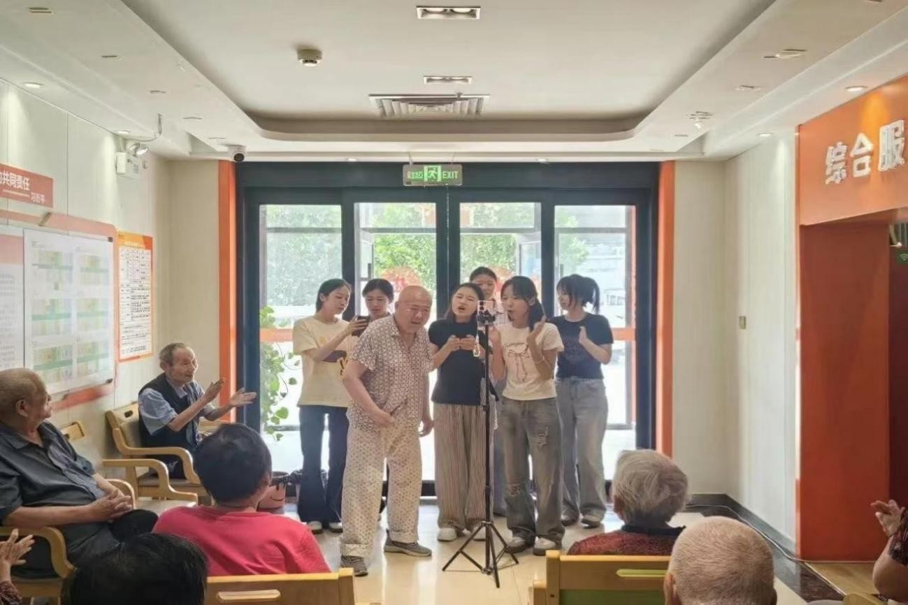 清晨的阳光洒进养老院庭院,身着绿色志愿服的同学们已忙碌起来。推轮椅护送老人回房时,志愿者们俯身倾听老人讲述往昔岁月;活动室里,同学们精心准备的《北京的金山上》《小白杨》等经典老歌引发全场共鸣。一位精神矍铄的老爷爷主动登台合唱,沧桑有力的歌声赢得阵阵掌声。表演结束后,同学们分散到老人身边亲切交流,握着老人布满皱纹的双手话家常,养老院里洋溢着温馨欢乐的气氛。