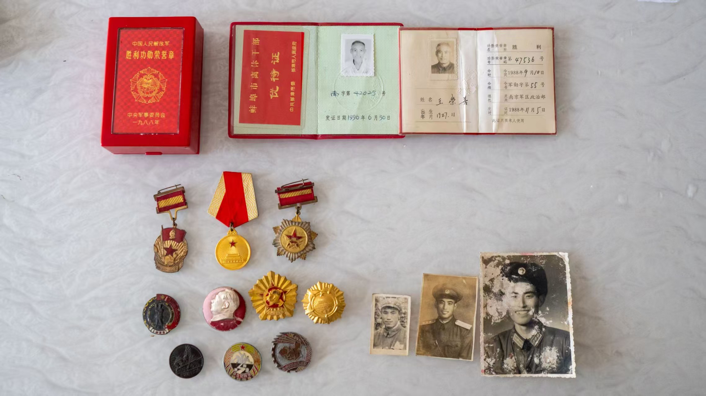 图2王崇善老人的旧照、徽章和证书余晨供图