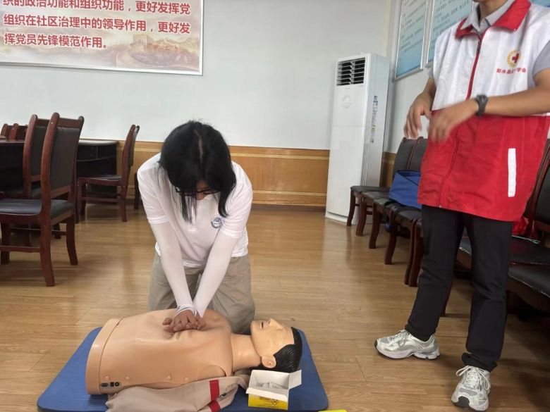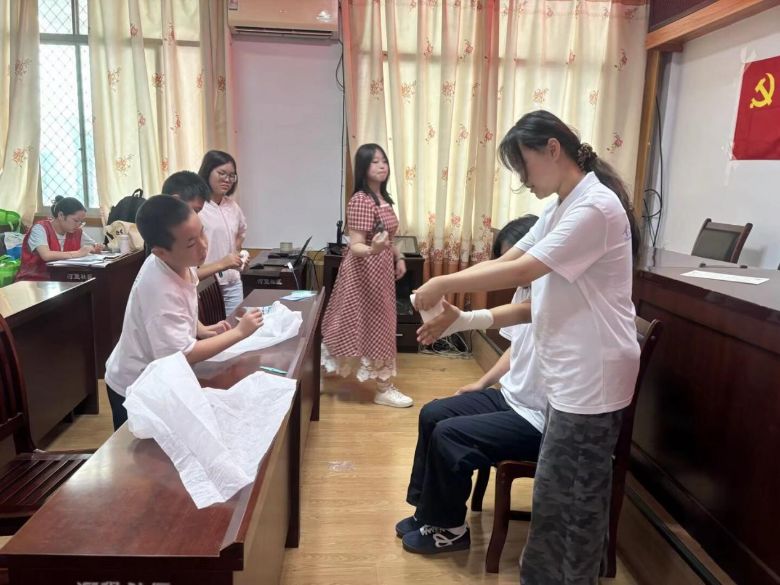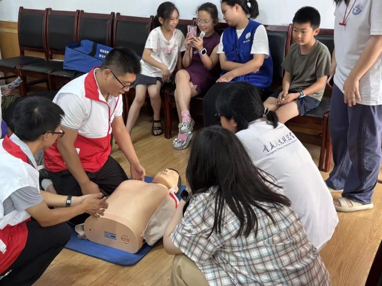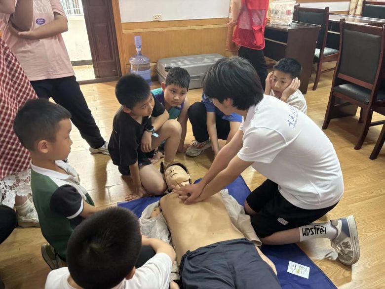 当日下午,实践团还开展了基础急救技能培训会。实践团成员分组演示心肺复苏、止血包扎等操作,特意准备的模拟人教具吸引了孩子们争相体验。通过实践团成员演示、听众亲身体验的方式,将理论落实到实处,让急救技能深入人心。