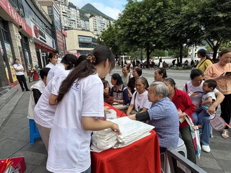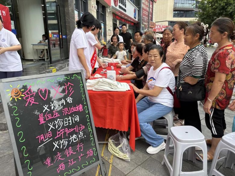 7月11日清晨,两江广场上的“爱心义诊”摊位前早早排起长队。实践团迅速开展测血压、查血糖、艾灸理疗等便民服务。在义诊过程中,实践团成员细心记录每位居民的检测数据,对血压偏高的5位老人进行健康生活方式指导,并留下社区卫生服务中心的随访电话。