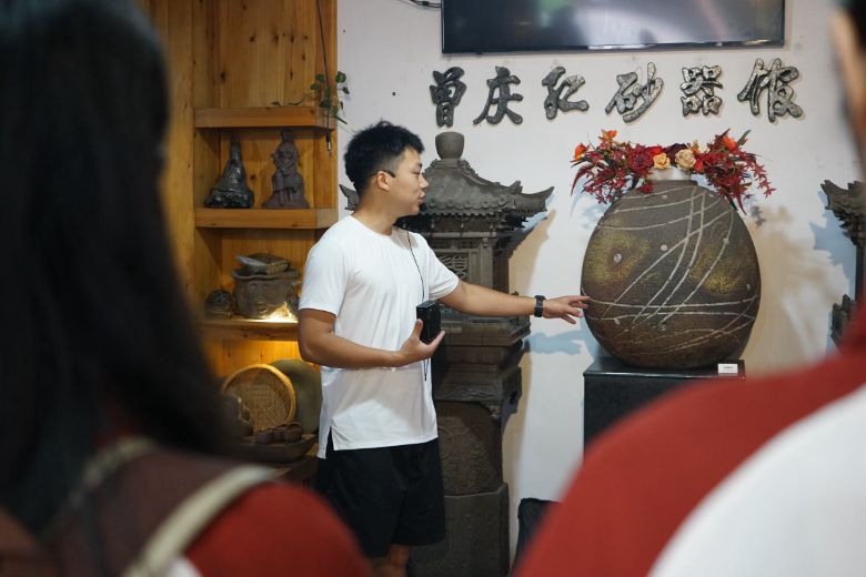 聆听历史回响,探寻黑砂深蕴。步入场馆,余学铭先是细致介绍“砂韵”、“癞宝壶”等黑砂珍品,其工艺之精令人称绝;继而从原料甄选、黑砂特质、核心技艺等方面系统阐释非遗黑砂的独特地位与珍贵价值。移步烧制区,队员观摩古朴的“馒头窑”,深入探秘素坯入窑的单一色泽,到出窑时砂器万般万彩的奇妙窑变过程,领略“荥经三彩”的绚烂魅力。“作为年轻一代非遗传承人,我们积极创新制作工艺,并通过线上直播让更多人见证黑砂之美。”余学铭讲解道。此外,他们更以“非遗互融”的巧思,将榫卯等古老技艺融入黑砂创作,让不同非遗在碰撞中绽放异彩,奏响非遗美美与共、互促共荣的美妙乐章。